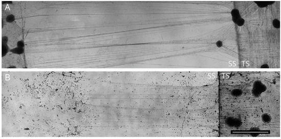Axonal stretching from DRG explants. Image showing neurons from DRG explants cultured on a stationary substrate (SS) and a mobile towing substrate (TS). Neurons cultured on both SS and TS when exposed to controlled stretching force yielded axons with bi-directional polarity (A), while neurons cultured exclusively on TS yielded axons with unidirectional polarity (B). Scale bar = 2 mm (reproduced with permission from Bryan J. Pfister, Department of Biomedical Engineering, New Jersey Institute of Technology, Newark, NJ, USA. Journal of Neurotrauma, 28 (11), 2011, 2389–2403, Mary Ann Liebert, Inc.).