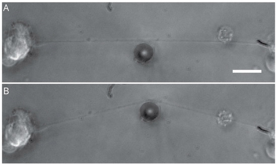 Stretching an individual axon. Image showing an unstretched (A) and a stretched (B) axon. The lateral stretching force was applied using an optical fiber cantilever. Scale bar: 20 μm (reproduced with permission from Pramod Pullarkat, Soft Condensed Matter Group, Raman Research Institute, Bengaluru, India, eLife; 2020, 9, 1–22).
