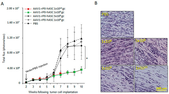 Determination of the minimum effective dose (MED) of AAV1-rP0-hASC control of HEI-193 intrasciatic schwannomas. (A) Growth kinetics of intrasciatic HEI-193 xenograft schwannomas following intra-tumoral (I.T.) with different doses of AAV1-rP0-hASC or PBS control (n = 8 per group). ANOVA indicated a significant effect of 1 × 1010 gc and 1 × 109 gc AAV1-rP0-hASC compared to PBS, but not of 5 × 108 gc or 1 × 108 gc AAV1-rP0-hASC (* p < 0.05). (B) Hematoxylin and eosin (H&E) staining demonstrated abundant, mitotically active hematoxylin-positive HEI-193 tumor cells in the mice which experimental schwannomas were injected I.T. with 5 × 108 gc and 1 × 108 gc of AAV1-rP0-hASC or PBS, but fewer tumor cells were in tumor-bearing nerves injected with 1 × 1010 gc and 1 × 109 gc AAV1-rP0-hASC.