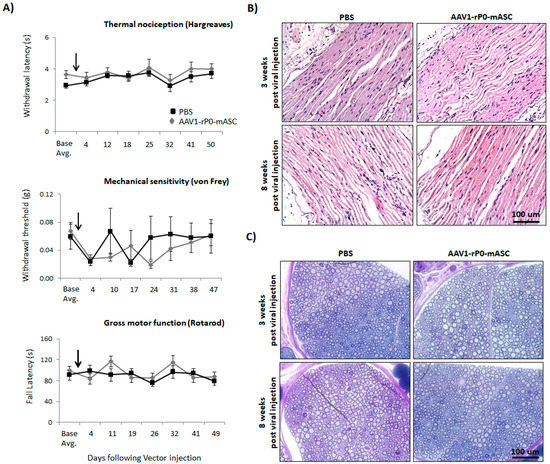 AAV1-rP0-mASC intra-sciatic injection of naïve immunocompetent C57BL/6 mice has no effect on sensory or gross motor function in vivo. (A) Effects of intrasciatic AAV1-rP0-mASC or PBS injection on pain behaviors, both thermal (Hargreaves test, top) and mechanical sensitivity (von Frey method, middle), and on gross motor function (rotarod, bottom) were evaluated at 2- to 7-day intervals for approximately 7-weeks following vector/PBS injection (arrows show time of intrasciatic injection). Repeated measures ANOVA was used to (1) compare behaviors of the AAV1-rP0-mASC and PBS injected mice, as well as (2) to conduct within group comparisons post virus injection at each time point to their respective baseline value. Results are represented as the mean ± SEM; n = 8 mice per group. (B,C) Neuropathological evaluation of sciatic nerve after AAV1-rP0-mASC or PBS injection; (B) hematoxylin and eosin and (C) toluidine blue staining of myelin in Epon-embedded sciatic nerve of naïve C57BL/6 mice. Cross sections of sciatic nerve collected 3- and 8-weeks post virus injection demonstrates essentially normal myelinated nerves with rare axonal degeneration.