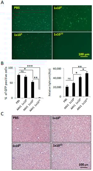 We next investigated the effect of AAV1 immunity on efficacy and safety of AAV1-rP0-mASC. We first determined the minimum AAV1 vector dose required to induce AAV1-neutralizing antibodies. Immunocompetent naïve C57Bl/6 mice were I.P. injected with different doses of a control vector lacking a transgene sequence downstream of rP0 (AAV1-rP0-null). One week after injection of the vector, the injected mice were harvested, and their blood sera evaluated for presence of AAV1 antibodies. The presence of AAV1 antibodies in the sera was confirmed using neutralization assay in HeLa cells [30] and ELISA assay [31]. For the neutralization assay, AAV1-CBA-GFP vectors were mixed with dilutions of blood sera from the mice injected with different doses of AAV1-rP0-null or PBS (n = 3/group) and incubated for 1 h at 37 °C before adding the mixture to HeLa cells for 1 h at 37 °C. Media were placed on the cells and the cells were incubated for 48 h before quantification with GFP expression, which was normalized to the transduction of the vector in the absence of serum. Our data showed that sera from mice injected with AAV1-rP0-null 1 × 1010 gc induced complete AAV neutralization as revealed by lack of GFP expression in the transduced HeLa cells (Figure 3A,B). We further confirmed the presence of AAV1 antibodies in the sera of the injected mice by ELISA assay, which showed that 1 × 1010 gc of AAV1-rP0-null induced the most significant antibodies, compared to the PBS injected mice (Figure 3B). The AAV1 injected mice did not show any signs of liver toxicity as revealed by H & E staining, compared to the PBS controls (Figure 3C).