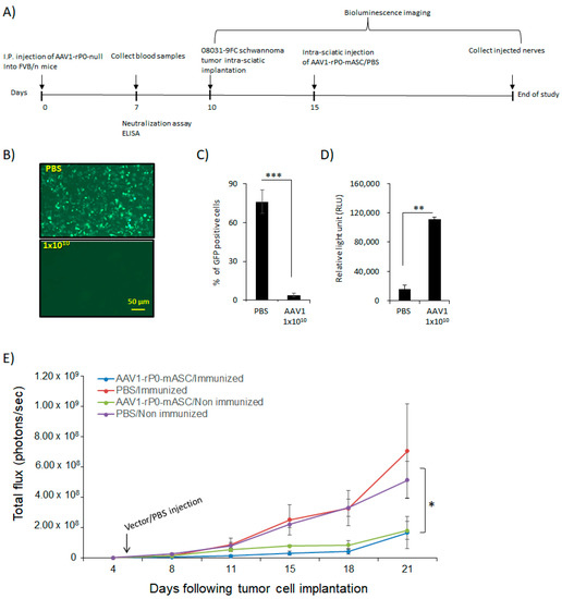 AAV1-rP0-mASC intra-tumoral injection of AAV1-preimmunized immunocompetent mouse schwannoma model slows tumor growth. (A) schematic diagram for the experimental design of the effect of AAV1 pre-existing immunity on the efficacy of the intratumoral AAV1-rP0-mASC injection into a syngeneic mouse schwannoma model in immune competent mice. (B) AAV1-rP0-null (1 × 1010 gc) or PBS were injected I.P. into immunocompetent FVB/n mice while blood sera were collected 1-week post injection. Dilutions of the collected sera were mixed with AAV1-CBA-GFP. After incubation for 1 h, mixtures were added to HeLa cells and two days later GFP expression were monitored. (C) Quantification of the GFP positive cells showed that AAV1-rP0-null injection resulted in complete neutralization of AAV1-CBA-GFP and thus reduced GFP expression compared to the sera collected from mice injected with PBS. (D) ELISA assay of AAV1 antibodies showed AAV1-rP0-null injection produced more significant AAV1 antibodies, compared to PBS. One-way ANOVA was utilized for statistical analysis. Results are represented as the mean ± SEM; n = 3 mice per group. ** p < 0.01, *** p < 0.001. (E) Intra-tumoral injection of the implanted syngeneic mice 5 days post-implantation of mouse 08031-9FC cells with AAV1-rP0-mASC vs. PBS control (n = 8 per group) in both AAV1 preimmunized and naïve mice. A significant difference was shown in the tumor growth of mice injected with AAV1-rP0-mASC in naïve and preimmunized mice, compared to the PBS injected groups. Repeated measures ANOVA was used to compare the tumor growth difference between the 4 groups. Results are represented as the mean ± SEM; (* p < 0.05).