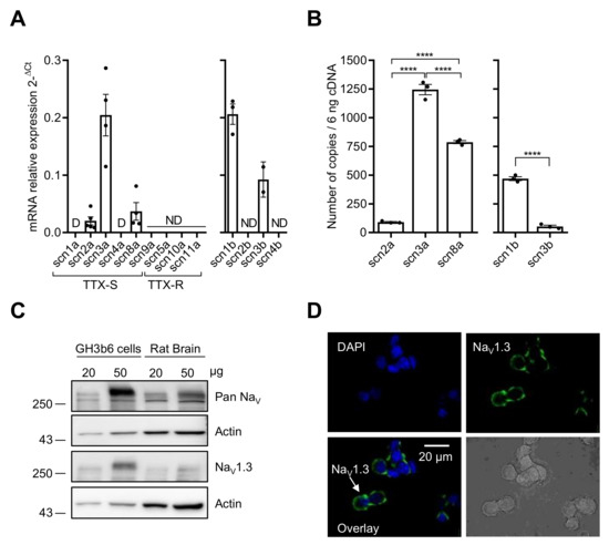 NaV channel expression in GH3b6 cells. (A) The mRNA expression levels of all α and β subunits were first determined by relative RT-qPCR. (B) RT-qPCR with absolute quantification for the genes, which were detected by relative RT-qPCR. One-way ANOVA (**** p < 0.0001) followed by Tukey post-hoc multiple comparison test was performed. The data are mean ± SEM. D: Disregarded (Ct > 32); ND: Not Detected. (C) Western blot analysis of NaV channel expression. Immunoblotting was performed using pan-NaV and Nav1.3 channels antibodies with 20 and 50 µg of protein extracts from GH3b6 cells and rat brain, after separation on 8% SDS-PAGE. Actin was the loading control. (D) Immunocytolocalization of NaV1.3 channels in GH3b6 cells. Fluorescence labeling (green) using Alexa Fluor 488 anti-mouse secondary antibody allowed the detection of NaV1.3 channels at the plasma membrane. Nuclei (blue) were stained with DAPI. Original magnification ×60.