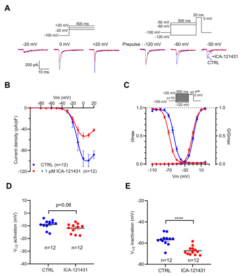 To explore the contribution of the NaV1.3 channel subtype in the genesis of INa in this cell line, we used ICA-121431 [31,32,33] and the β-scorpion toxin Tf2 [32,34], two selective ligands of this NaV channel subtype. At 1 µM, ICA-121431 reduced by 50% the amplitude of INa when they were elicited by depolarizing pulse from −100 mV, while it almost abolished INa evoked by the depolarizing pulse from −50 mV (Figure 3A). ICA-121431 reduced the INa amplitude in a non-voltage-dependent manner (Figure 3B), and thus did not alter the voltage dependency of activation (p = 0.06) (Figure 3C,D). However, ICA-121431 induced a negative shift of 10.3 mV (p < 0.0001) of the voltage dependence of inactivation (Figure 3C,E). These data are in agreement with previous data indicating that ICA-121431 preferentially interacts with inactivated NaV1.3 channels [31,32,33]. At a very low concentration (1 nM), Tf2 strongly altered the activation of INa.