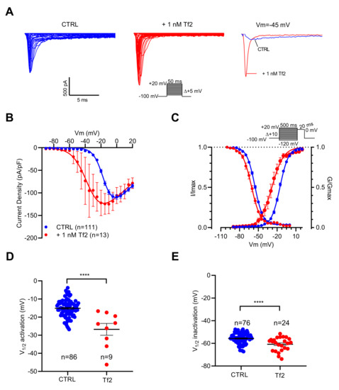 As illustrated in Figure 4A, depolarizing pulses elicited INa with higher amplitudes in the presence of the Tf2 compared to the control. The current–voltage relationships showed that NaV channels opened at potentials more negative in the presence than in the absence of Tf2 (Figure 4B). The V1/2 of activation was positively shifted by 11.7 mV (p < 0.0001) (Figure 4C,D). In addition, Tf2 induced a negative shift of V1/2 of inactivation by 5.1 mV (p < 0.0001) (Figure 4C,E). In conclusion, INa is sensitive to both ICA-121431 and Tf2, indicating that it is promoted by the NaV1.3 channel subtype.