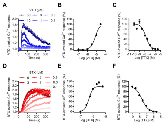 Effects of VTD and BTD, two selective NaV channel activators, on the intracellular Ca2+ level in GH3b6 cells. (A,D) Representative kinetics of Fura-2 fluorescence in GH3b6 cells treated with increasing concentrations of VTD or BTX. The increase of the Fura-2 fluorescence emission ratio reflects [Ca2+]i elevation. (B,E) The Ca2+ responses induced by VTD and BTX are concentration dependent. In both cases, the concentration–response relationships were analyzed using the Hill–Langmuir equation with variable slope. The values of EC50 and the Hill coefficient were respectively 5.39 ± 2.3 µM and 2.00 ± 0.21 with VTD (R2 = 0.98) and 0.66 ± 0.18 µM, 2.88 ± 0.15 with BTX (R2 = 0.95). (C,F) The NaV channels involved in Ca2+ responses induced by VTD and BTX are TTX-S. TTX inhibits in a concentration-dependent manner the Ca2+ responses elicited by 10 µM of VTD (C) or by 1 µM of BTX (F) with similar IC50 (15.63 ± 0.72 nM, 21.13 ± 3.32 nM, respectively) and Hill coefficients (1.21 ± 0.21, R2 = 0.97 and 0.95 ± 0.04, R2 = 0.99 for VTD and BTX, respectively). Data represent the mean ± SEM (n = 3 wells) and are representative of at least two independent experiments.