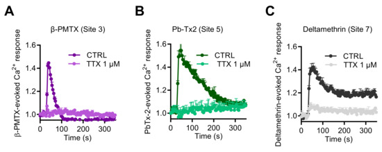 Finally, to explore if other neurotoxins, which activate NaV channels through binding to other pharmacological sites, could also enhance [Ca2+]i, we tested the wasp venom peptide β-PMTX (Site 3) [31,35,36], the marine toxin PbTx-2 (Site 5), and the pyrethroid deltamethrine (Site 7). These three molecules induced intracellular Ca2+ responses with various kinetic profiles (Figure 7). At 100 µM, β-PMTX triggered a rapid and transient Ca2+ elevation, in a concentration-dependent manner, as observed with VTD (Figure 7A). In comparison, PbTx-2 (3 µM) provoked a rapid response followed by a slower decrease of the Ca2+ signal (Figure 7B). In contrast, deltamethrine (10 µM) caused Ca2+ responses with a peak, followed by a plateau (Figure 7C). Ca2+ responses induced by these three toxins were fully blocked by TTX at 1 µM.