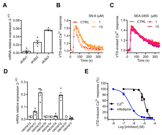 Effects of NCX and CaV channel inhibitors on VTD-evoked Ca2+ responses in GH3b6 cells. (A) The expression profile of NCX1–3 genes (scl8a1–3) in GH3b6 cells was characterized by relative RT-qPCR. The data are mean of mRNA relative expression ± SEM. Effects of SN-6 (B) and SEA0400 (C), two specific inhibitors of NCX, on VTD-induced Ca2+ responses in GH3b6 cells. VTD was used at 10 µM. (D) The expression profile of CaV channel genes (cacna1a–e, g–i, and s) in GH3b6 cells was characterized by relative RT-qPCR. The data are mean ± SEM. D: Disregarded (Ct > 32); ND: Not Detected. (E) Concentration–inhibition relationship of VTD-induced Ca2+ responses by nifedipine, a specific blocker of L-type CaV channels (IC50 = 1.04 ± 0.65 µM, Hill slope = 1.30 ± 0.11, R2 = 0.98) and Cd2+, a blocker of CaV channels (IC50 = 9.76 ± 1.74 µM, Hill slope = 2.35 ± 0.03, R2 = 0.97) with VTD used at 10 µM. Data represent the mean ± SEM (n = 3) from two independent experiments.