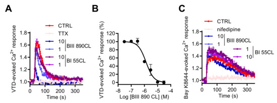 Effects of BIII 890CL on Ca2+ responses triggered by VTD or Bay K8644. (A) Representative Fura-2 fluorescence kinetic traces illustrating Ca2+ response induced by 10 µM of VTD, alone or co-injected with 1 µM of TTX or with 10 or 1 µM of BIII 890 CL or with BI 55CL (10 and 1 µM), used as a negative control. (B) Concentration–inhibition relationship of VTD-induced Ca2+ responses by BIII 890CL, (IC50 = 1.47 ± 0.18 µM, Hill slope = 1.26 ± 0.23, R2 = 0.94). (C) Representative Fura-2 fluorescence kinetics traces illustrating Ca2+ response induced by 1 µM of Bay K8644, a specific L-type CaV channel activator, alone or co-injected with 10 µM of nifedipine or with 10 or 1 µM of BIII 890 CL or with BI 55CL (10 and 1 µM), used as a negative control. Data represent the mean ± SEM (n = 3) of recordings of two independent experiments.