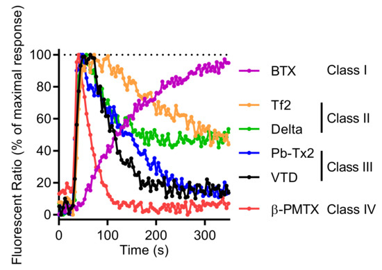 Other neurotoxins activating NaV channels, such as BTX or the β-scorpion toxin Tf2 [32,34], the wasp toxin β-PMTX [31], the marine toxin PbTx-2 [3], and the pyrethroid deltamethrin [54], are also able to increase [Ca2+]i in GH3b6 cells. Moreover, the kinetics of Ca2+ entry exhibited different patterns according to each type of neurotoxin (Figure 10). Since these Ca2+ responses result from membrane depolarization mediated by NaV channels, their distinct kinetics likely reflect the NaV channel gating modification induced by their interaction with these ion channels. For example, although BTX and VTD both bind to Site 2 of open-state NaV channels and block the inactivation process, BTX induced a slow and sustained Ca2+ responses, while VTD triggered rapid Ca2+ responses (Figure 10). This is probably because BTX permanently maintains NaV channels in the open state, whereas VTD behaves as a partial activator, triggering reversible and rapid alteration of the inactivation process [55,56]. Thus, according to the profile of [Ca2+]i elevation kinetics, four types of NaV activator “class” can be distinguished (Figure 10). For class I (BTX), a slow and sustained increase of [Ca2+]i time-rate was observed. For class II (deltamethrin and Tf2 toxin), a rapid [Ca2+]i increase was followed by a slow decrease. For class III (VTD and PbTx-2), intermediate rapid [Ca2+]i elevation kinetics with a peak were seen. Finally, for class IV (β-PMTX), the responses were characterized by a rapid and transient kinetics. Altogether, our model allows the establishment of a “fingerprint” for each class of NaV channel activators.