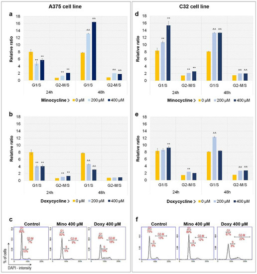 Influence of minocycline and doxycycline on cell cycle of tested amelanotic melanoma cells. The results of the analysis are presented as a relative ratio of G1/S and G2-M/S for A375 (a,b) and C32 (d,e) cell lines. Representative histograms indicate the distribution of tested cells in the individual phases of the cell cycle after 48 h treatment with the tested drugs (c,f). ** p < 0.005 vs. control 24 h; ^^ p < 0.005 vs. control 48 h.