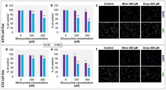 Analysis of melanoma cell viability after the treatment with minocycline and doxycycline. The results are expressed as a percentage of control. Bar graphs present the results for A375 (a,b) and C32 (d,e) cell lines. Representative images (c,f) show analyzed cells stained with acridine orange AO (all cells) and DAPI (dead cells). ** p < 0.005 vs. control 24 h; ^^ p < 0.005 vs. control 48 h.