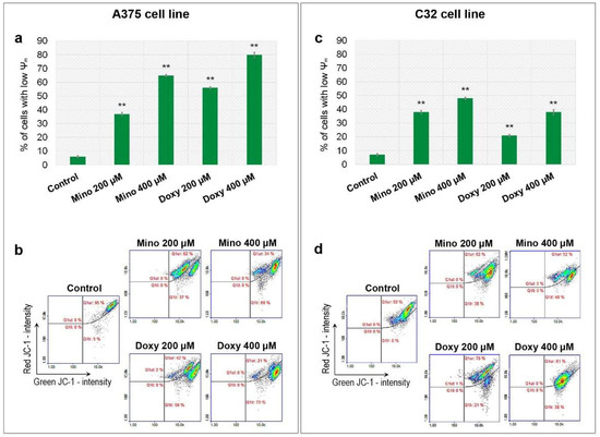 Analysis of mitochondrial membrane potential (ψm) after the treatment of melanoma cells with minocycline and doxycycline. Bar graphs present the results for A375 (a) and C32 (c) cell lines. Representative scatter plots (b,d) display tested populations of stained cells divided by a gate into the subpopulations of cells with polarized and depolarized mitochondria. ** p < 0.005 vs. control.