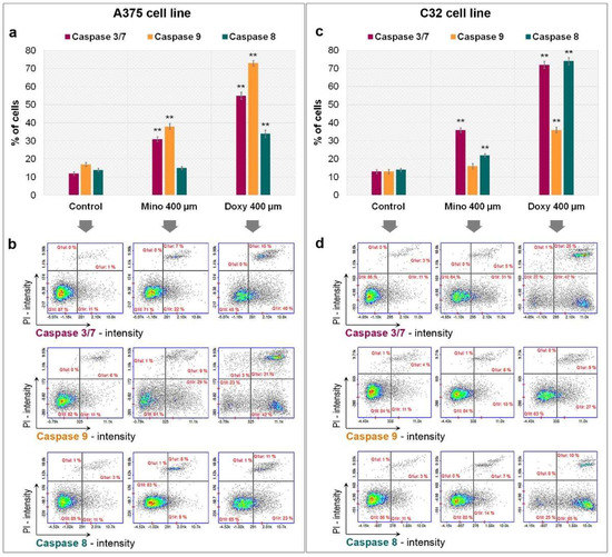 Analysis of caspase activity after the treatment of melanoma cells with minocycline and doxycycline. Bar graphs present the results for A375 (a) and C32 (c) cell lines. Representative scatter plots (b,d) present PI- and FLICA-stained cells divided by a gate into the subpopulations of cells without and with activated caspase. ** p < 0.005 vs. control.
