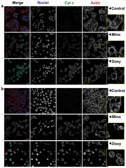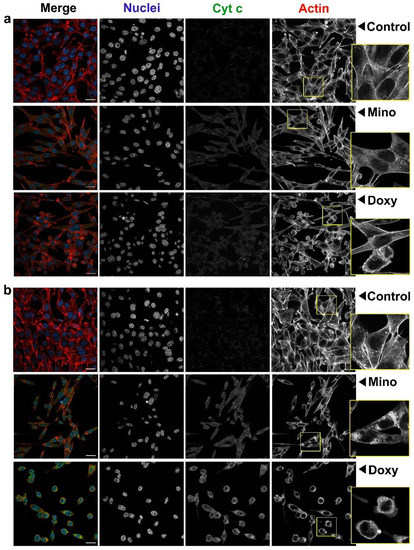 Imaging with confocal microscopy of A375 amelanotic melanoma cells treated with 400 µM minocycline and doxycycline for 24 h (a) and 48 h (b). Photographs present merged images as well as separate channels for nuclei, cytochrome c, and actin filaments. Scale bar 25 µM.