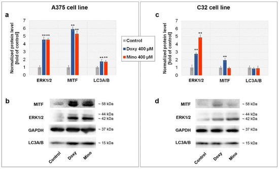 Analysis of ERK1/2, MITF, and LC3A/B level after the treatment of melanoma cells with minocycline and doxycycline. Bar graphs present normalized results for A375 (a) and C32 (c) cell lines. Corresponding representative blot images (b,d) for analyzed proteins are also shown. ** p < 0.005 vs. control.