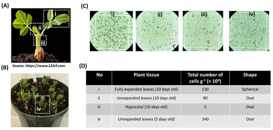Protoplast isolation from different tissues and ages of peanut seedlings: (A) 10 days old; (B) 5 days old peanut seedlings; (C) protoplast from different tissues (i, ii, iii, and iv) of A and B; (D) the total number of protoplasts and their shapes from different tissues of peanut seedlings.