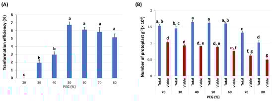 Effect of PEG concentration on protoplast transfection: (A) the transformation efficiency (TE) of protoplasts cultivated with various concentrations of PEG. TE was calculated after 24 h cultivation; (B) the effects of PEG concentration on the number of protoplasts. The number of total protoplasts and viable protoplasts counted after 24 h cultivation. Values represent means ± SE (n = 7). The different letters indicate significant differences at p < 0.05.