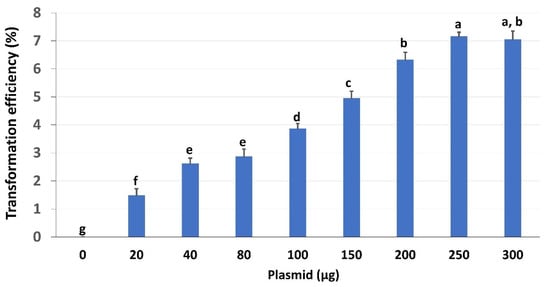 Effects of plasmid concentrations on protoplast transfection: The transformation efficiency of protoplasts cultivated with various concentrations of plasmids. The protoplast was evaluated after incubation in 50% PEG solution for 10 min. Values represent means ± SE (n = 7). The different letters indicate significant differences at p < 0.05.