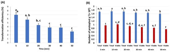Effects of PEG incubation time on protoplast transfection: (A) the transformation efficiency of protoplasts cultivated with various PEG incubation times; (B) the effects of incubation time in PEG on protoplasts. The number of total protoplasts and viable protoplasts was counted after 24 h cultivation; 50% PEG solution was used in this experiment. Values represent means ± SE (n = 7). The different letters indicate significant differences at p < 0.05.
