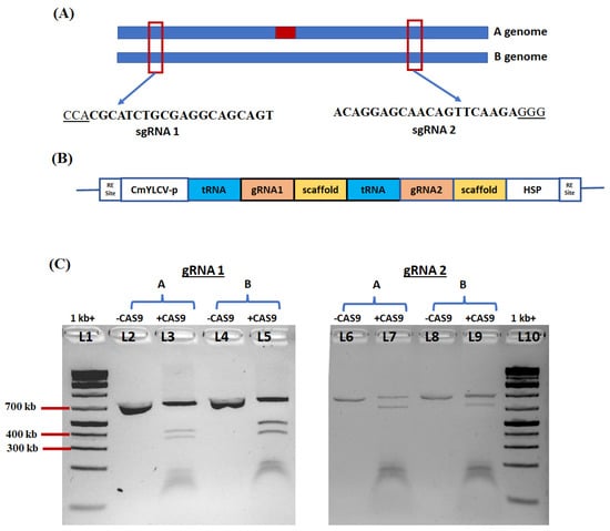 Schematic diagram of the peanut Ara h 2 target gene copies, tRNA–sgRNAs of Ara h 2, and in vitro digestion of Ara h 2 gene targets: (A) schematic diagram representation of peanut Ara h 2 gene copies at A and B genome and gRNA target regions; (B) schematic diagram representation of tRNA–sgRNAs of Ara h 2; (C) in vitro digestion of Ara h 2. L1 and L10: 1kb+ ladders; L2: uncut Ara h 2A target region (genome A); L3: Ara h 2A target region digested with Cas9 and sgRNA1 (expected bands of 399 bp and 376 bp); L4: uncut Ara h 2B target region (genome B); L5: Ara h 2B target region digested with Cas9 and sgRNA1 (expected bands of 396 bp and 380 bp); L6: uncut Ara h 2A target region (genome A); L7: Ara h 2A target region digested with Cas9 and sgRNA2 (expected bands of 596 bp and 199 bp); L8: uncut Ara h 2B target region (genome B); L9: Ara h 2B target region digested with Cas9 and sgRNA2 (expected bands of 564 bp and 212 bp).