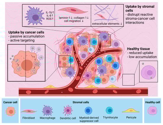 Interactions of AgNPs with cancer and stromal cells of the tumor tissue and with healthy cells. AgNPs are accumulated in tumor tissue passively or can be targeted to the tumor actively. AgNPs affect the stroma-cancer cell communication. Reduced accumulation of nanoparticles is observed in healthy tissues. The figure was created with BioRender.com.