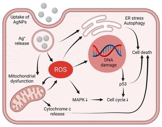 Following the uptake of AgNPs, Ag ions released from the nanoparticles contribute to the generation of reactive oxygen species. Ag ions directly or via oxidative stress cause mitochondrial dysfunction, ER stress, autophagy and DNA damage, leading to apoptosis. The figure was created with BioRender.com.