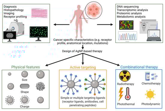 Merging modern diagnostic approaches provided by personalized cancer management and rational AgNP design can improve the anti-cancer efficiency of AgNPs. A detailed tumor phenotyping based on imaging and traditional histology techniques, together with high-throughput molecular characterization methods, can aid to select and design the ideal nanoparticle candidate with optimal size/shape, targeting the moiety and therapeutic combinational partner for each patient. The figure was created with Biorender.com.