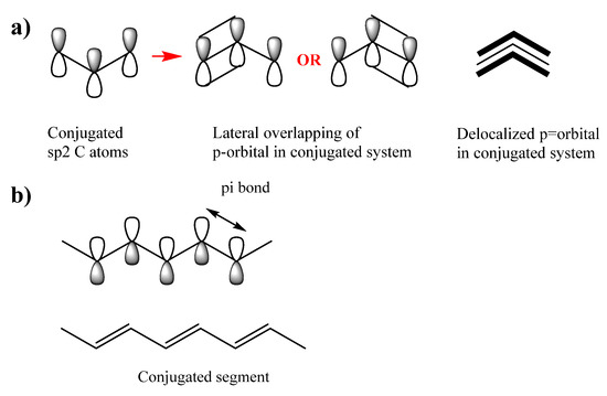 Electrons of good conductive metals are delocalized as the valence (outermost) electrons of a metal atom, which are held loosely, thus allowing them to flow more freely. Polymers can also be as conductive as metals when the monomeric units can form in the polymer in a so called conjugated system [55]. In such a system, the polymeric chain backbone contains alternating double and single bonds [56,57]. This alternating structure enables overlapping p-orbitals in which the π-electrons are loosely bound and accordingly can flow as shown in Figure 1 of poly(acetylene) [58].
