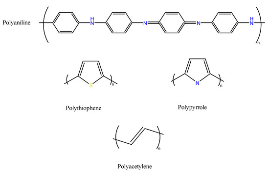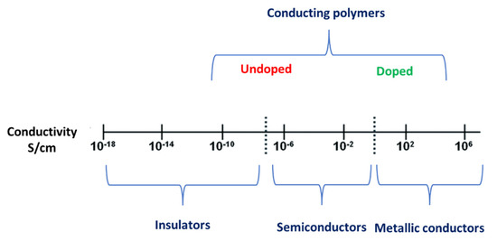 However, the conjugated polymer has to be doped by the addition of electrons (reduction) or the removal of electrons (oxidation) to promote electrons to flow. In the doped conjugated polymers, the π-electrons can move around the polymer molecules [59,60]. Accordingly, undoped conjugated polymers conduct electricity in a very low semiconductor range 10−2–10−8 S/cm. In contrast, the electrical conductivity of the doped conjugated polymers increases several fold to meet the requirement of different electric applications such as rechargeable batteries [61,62], solar cells [63,64,65], chemical, and gas sensors [66,67,68], etc. (Figure 2) [53].