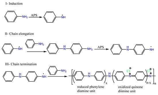 The electrochemical polymerization of aniline has many advantages over other techniques because it does not need a special procedure for the purification of PANI from solvent, unreacted monomer, and oxidizing agents. It occurs on an electrode that is made of an inert conducting substrate in an aqueous solution of low pH [79]. However, the chemical polymerization of aniline (Figure 4) using various oxidants, most commonly ammonium persulphate, in strong acid medium at 0 °C results in two structural units; reduced phenylenediamine unit and oxidized quinone diimine unit (Figure 4III) [80,81]. The PANI chain is electrically conductive only when the ratio of these two units is 1:1 and is known for its greenish color [82].