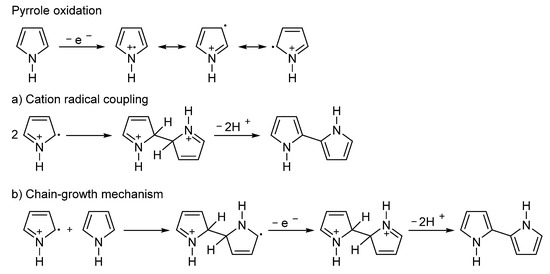 The polymerization of pyrrole [83] can be performed either by chemical oxidation [70] or electrochemically [84]. In the first step, the oxidation is accompanied by an electron release from the pyrrole ring, forming a radical cation [85]. In the next step, the two generated radical cations are coupled, followed by the deprotonation of two hydrogen atoms to yield bipyrrole (Figure 5a). This step is repeated many times to produce the polymer chains. In addition, the radical cation can react with the pyrrole ring to produce a polymer by a chain-growth polymerization mechanism (Figure 5b). Both mechanisms are expected to take place simultaneously. Similarly to PANI, PPy also requires a doping agent to increase the electrical conductivity [86]. Recently, a single-step conversion of renewable furfural to pyrrole in 75% yield was reported, therefore, PPy can be also considered as a potential renewable polymer [87].