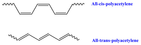 Polyacetylene (PA) is constructed from the polymerization of acetylene to obtain polymer chains of repeating units of olefin [88,89]. PA is another polymer which can be considered as potentially renewable, as acetylene can be produced from calcium carbide which is obtained from calcium carbonate [90,91]. PA is considered as the first conductive polymer compared to metals and it exists in two isomeric forms: trans and cis conformations (Figure 6); the highest electrical conductivity is achieved for the trans conformation [92].