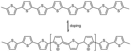 Doping by using any oxidizing agents, as shown in Figure 8, is a very critical step to obtain an electrically conductive PT salt form. Among different oxidizing agents that are used for doping of PT, highly electrical conductive PTs were achieved by using iodine and bromine [104].