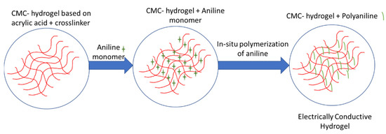The preparation of conductive hydrogels that are based on PANI has shown tremendous attraction towards different applications such as water treatment [69], supercapacitors [126], and bone tissue engineering [7]. Bagheri et.al [69] first prepared hydrogel by the polymerization of acrylic acid in the presence of carboxymethyl cellulose (CMC), a small amount of a cross-linker, and ammonium persulfate (APS) as an initiator (Figure 10). Since the formed sulfate anion radicals can trap the hydrogen from the hydroxyl groups of the CMC, grafting of the acrylic acid onto CMC can occur as well during the polymerization and, thus, it is directly chemically incorporated into the hydrogel structure [21]. The CMC hydrogel was immersed into aniline solution which was polymerized by ammonium persulfate and doped by hydrochloric acid. The prepared conductive hydrogel showed an electrical conductivity as high as 0.75 S/cm. The conductivity was similar to the conductivity value of 0.65 S/cm that was determined for the PANI-based hydrogel that was prepared purely from polyacrylamide [30].
