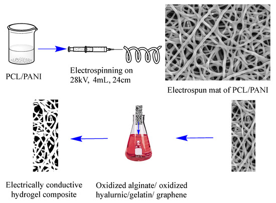 Khorshidi et al. [7] used oxidized polysaccharides such as oxidized alginate and hyaluronic acid that were mixed with gelatin and conductive filler, such as graphene. The mixture was spontaneously gelled through a Schiff-base mechanism in the presence of electrospun fibers that were prepared from a solution of PANI and polycaprolactone (PCL) (Figure 11). Due to the small portion of PANI, the final composite hydrogel showed quite low electrical conductivity of 10 ± 1 × 10−6 S/cm. That was, however, sufficient for the application as tissue engineering scaffolds with improved adhesion, spreading, and proliferation of osteoblast-like cells.
