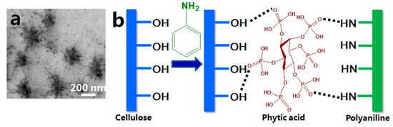 Electrically conductive scaffold that is based on regenerated cellulose and PANI: (a) Transmission electron microscope image of the cross-section of the conductive side of PANI/ regenerated cellulose; (b) The proposed mechanism of the polymerization reaction and the hydrogen bonding between cellulose/aniline/phytic acid. Reprinted with permission from reference [128].