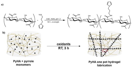 (a) Scheme of hyaluronic acid (HA) modification by pendant pyrrole moieties to produce PyHA and (b) schematic drawing of the oxidative polymerization of pyrrole in the presence of PyHA. Reprinted with permission from reference [32].