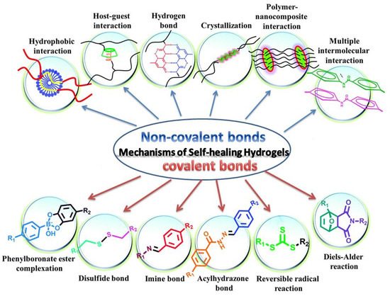 The original thought of self-healing substrate was the thermoplastic polymer that converts to liquid at high temperature and turns back to solid at cold temperature. In hydrogels, there are two main mechanisms that can lead to self-healing behavior based on the dynamic covalent bonds in chemical cross-links or non-covalent bonds in physical cross-links (Figure 14) [141].