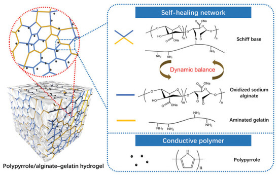 - Ren, K.; Cheng, Y.; Huang, C.; Chen, R.; Wang, Z.; Wei, J. Self-healing conductive hydrogels based on alginate, gelatin and polypyrrole serve as a repairable circuit and a mechanical sensor. J. Mater. Chem. B 2019, 7, 5704–5712. [Google Scholar] [CrossRef]
