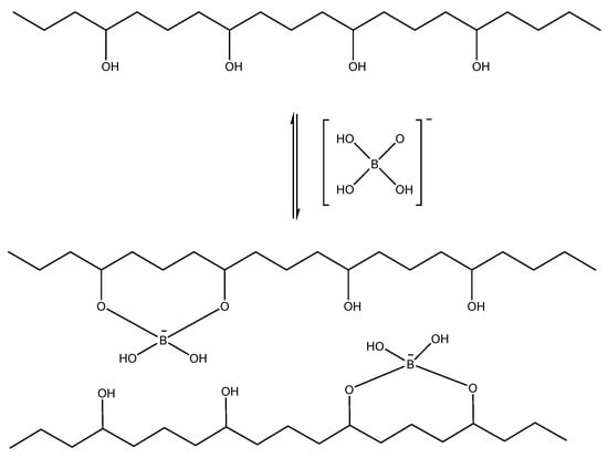 Polyol/borax self-healing hydrogels showed superior advantages over the rest of the covalent bond mechanisms as the hydrogel can be formed without any need for chemical modifications of the polymeric components. Figure 17 shows the simple mechanism of borax dissociation in water into boric acid and borate ions that can chemically cross-link the hydroxyl-containing polymers, such as carbohydrates and polyols, through boron ester bonds. An alkaline medium is preferable for this reaction to provide densely cross-linking hydrogels as more borate ions (B(OH)4−) are available over the boric acid (B(OH)3) [140].
