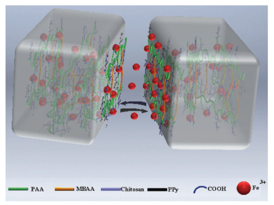 Chemically cross-linked chitosan was also used to prepare electrical conductive hydrogels by graft-polymerization of acrylic acid [130]. The fabricated hydrogel was stirred with PPy, doped with ferric chloride in the presence of polyethylene glycol for better homogenization, and subsequently mixed also with magnetite nanoparticles (Fe3O4). The composites with electric conductivity up to 10−3 S/cm were prepared in this approach. Since the hydrogel was stirred with the additives, such as PPy and Fe3O4, the final composite was not in the form of a compact hydrogel. Thus, this synthetic approach can be used only for limited applications.