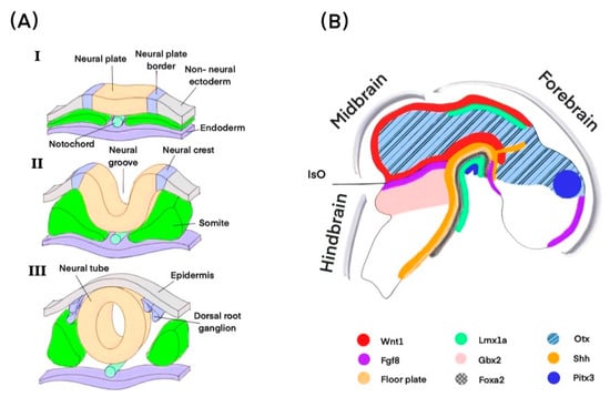 Development of brain cells. (A) Neural tube formation (I–III). (B) TFs, morphogens, and signaling involved in mdDA neuron formation. Otx and Gbx2 function in opposition to one another to establish the position of the IsO, which defines the midbrain-hindbrain boundary. IsO regulates Fgf8, which, along with Shh, specifies the location of midbrain mdDA neuron growth. Shh stimulates Foxa2 expression, and Wnt1 is expressed in this region and required for midbrain development. Lmx1a is defined in the ventral midbrain; Pitx3 plays a role in the mdDA neuron differentiation. Abbreviations: TFs, transcription factors; IsO, isthmic organizer; Otx, Orthodenticle homeobox 2; Gbx2, Gastrulation brain homeobox 2; Fgf8, Fibroblast growth factor 8; Foxa2, Forkhead box A2; Lmx1a, homeobox transcription factor 1 A; Pitx3, Paired-like homeodomain3; and Shh, Sonic Hedgehog.