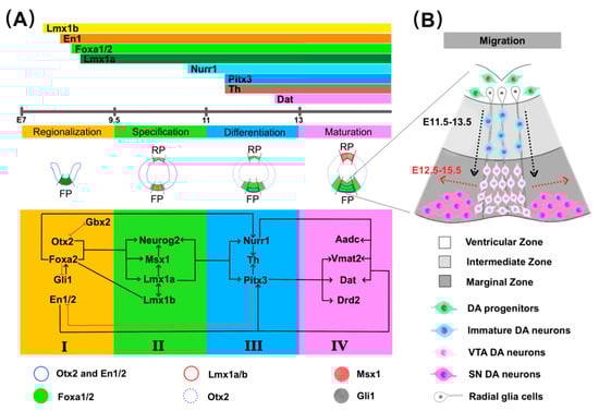 The differentiation and maturation of mdDA neurons are accompanied by their migration. mdDA neurons migrate away from the FP of the ventral mesencephalon, called the ventricular zone (VZ), into the mantle layer and form three different mdDA neuron clusters: SNpc (A9) on the lateral side, VTA (A10) on the medial side, and the posterior retro-rubral field (RRF; A8) [37]. Previous research shows that mdDA neurons migrate first radially between E11.5–13.5 after exiting the cell cycle, and then some mdDA neurons begin to migrate tangentially into the laterally-situated SNpc medially-located VTA at E12.5 (Figure 2B) [56]. Furthermore, not all SNpc mdDA neurons migrate tangentially after radial migration; some mdDA neurons migrate radially into the dorsal SNpc [57]. It has been proposed that the chemokine (C-X-C motif) ligand 12 (CXCL12) and its receptor CXCR4 [58] are involved in regulating the radial migration, and L1 cell adhesion molecule (L1CAM) and potential L1CAM ligand–protein tyrosine phosphatase, receptor type Z, polypeptide 1 (PTPRZ1) [37] modulate the tangential migration of mdDA neurons as well as Reelin signaling [56,59]. Recent research found that Netrin-1 mediates dorsal mdDA neuron migration into SNpc along radial glia fibers, and axon-derived Netrin-1 attracts GABAergic neurons into substantia nigra pars reticula (SNr) [57]. Moreover, early B-cell factor 1 (Ebf1), an essential TF in B-lymphocyte differentiation, has been implicated in mdDA neuron migration. Cellular Ngn2 disruption causes both an arrest of cell migration and a failure of cell differentiation [60].