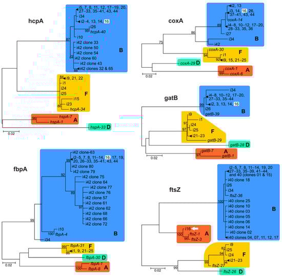 Maximum likelihood (ML) phylogenetic trees for each MLST gene. Acrididae isolates (Table 2), supergroups (A, B, F, and D), and bootstrap values are indicated. Model of nucleotide substitutions T92+G was used for gatB, hcpA, and fbpA datasets; HKY+G for coxA; T92+G for ftsZ. White squares and the arrow indicate a case (i-16) of a supergroup clustering conflict. See original files in Supplementary Materials.