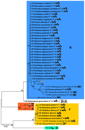 To examine the relationship of the Wolbachia variants isolated from Acrididae with other Wolbachia strains, we reconstructed a phylogenetic network (Figure 3, Supplementary Materials). The dataset that was used for this analysis included Wolbachia haplotypes from different hosts that contained at least one allele that was identical or that was closely related to Wolbachia isolates from Acrididae (see Materials and Methods). Most Wolbachia isolates of Acrididae (actually the hST-4 group) formed a separate bundle in the phylogenetic network without isolates from other hosts. Even i-16, which is an inter-supergroup recombinant, occupied a long branch in this bundle. The remaining Wolbachia haplotype hST-10 (i-34) manifested a close relationship with isolates from Gryllidae hosts. Of note, i-34 was isolated from the Prumna primnoa population of Sakhalin in 2010, where the hST-4 (i-33) haplotype was identified as well. Haplotypes of the F supergroup also formed a separate bundle. Only the F-supergroup Wolbachia haplotype ST-448 isolated from Teratodes monticollis (Acrididae: Teratodinae) was noticeably different in the allele set and genetic distance (p-distance 0.0293–0.0313). Therefore, the additional data from the MLST profiles based on allele similarity confirmed that the analysed Acrididae subfamilies have a specific genetic pattern of Wolbachia.