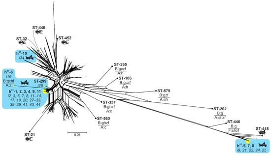 Wolbachia strains belonging to supergroup F were detected in five species. Haplotypes of complete profiles (hST-5, -7, and -8; p-distance 0.0024–0.0053) and isolates with incomplete profiles (i-1 and i-15) or with ambiguous sites (i-24 and i-25) were found to be closely related, i.e., genetic diversity was also rather low. A comparative analysis of the haplotype diversity of supergroup F retrieved from the PubMLST database showed that variants of the Acrididae isolates formed a separate cluster (Figure S1).