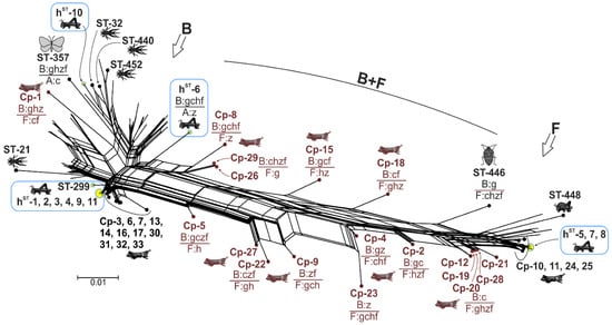 Martinez-Rodriguez and Bella [] reported the Wolbachia MLST diversity of Ch. parallelus in Spanish and French locations. We retrieved sequences of five MLST loci deposited by [] in GenBank, combined them with the dataset of our phylogenetic network, excluded redundant portions of sequences, and reconstructed a new phylogenetic network (Figure 4, Supplementary Materials). Half of the Wolbachia variants from Ch. parallelus matched the genetic pattern discovered in our collection for both the B- and F-supergroup haplotypes. The other half represented B–F supergroup recombinants. B–F recombinants were registered by []; here, we reported detailed characteristics of some variants (details in Figure 4). It is worth pointing out that the recombination occurred at all possible loci, thereby giving rise to 18 unique haplotypes in total.