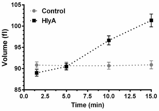RBCs at 10% hematocrit were incubated in the absence of toxin (Control), or in the presence of 100 ng/mL HlyA (HlyA) at 37 °C during the times indicated in the figure. Then, MCV was measured by impedance cell cytometry, as indicated in Section 4.9. Points represent the mean values and error bars represent standard error of the mean (S.E.M.). (Control, N = 20; HlyA, N = 15).