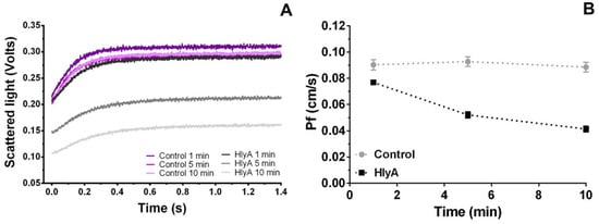 (A) SSC kinetics of HlyA pre-treated RBCs. RBCs suspensions at 10% hematocrit were treated with HlyA 100 ng/mL for 1, 5 and 10 min at 37 °C. After preincubation, cells were exposed to a hyperosmotic medium and the osmotic shrinkage of the cells was monitored by measuring the SSC signal in stopped-flow equipment as indicated in Section 4.7. Control experiments were performed in the absence of toxin. (B) Osmotic water permeability (Pf) as a function of time of HlyA preincubation. Values of Pf were calculated as detailed in Section 4.8 from SSC data. Data is represented as a function of the time during which cells were pre-exposed to 0 (control) or 100 ng/mL HlyA before stopped-flow experiments were performed. Values represent means ± S.E.M. (Control, N = 18; HlyA, N = 15).